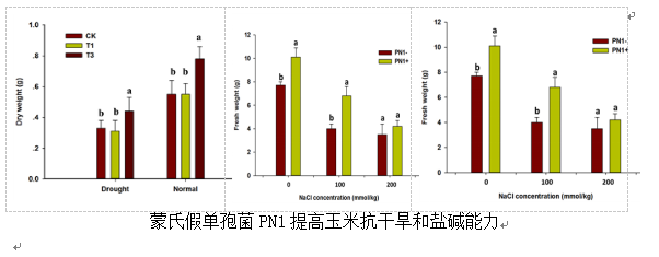 本研究以东北地区主要栽培作物玉米为植物材料,通过浇灌菌液的方法,探究蒙氏假单胞菌(Pseudomonas monteilii PN1)增强玉米幼苗对干旱和盐碱胁迫的抵抗能力。将蒙氏假单胞菌以25 ml/kg(菌液体积/土壤质量,OD600=0.1)量添加到土壤中,菌液对干旱和盐碱胁迫下的玉米幼苗生长有促生作用。多功能促生菌PN1能提高玉米幼苗对非生物胁迫的抗性,为逆境条件下,玉米等作物安全、绿色和高效生产提供技术支持。