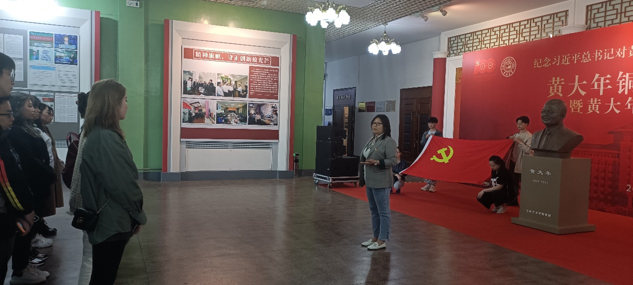 参观前,大家在现场观看了黄大年铜像的捐赠仪式,并邀请公司党委书记姜治莹与参加党日活动的支部师生合影。姜治莹书记与本科员工党支部书记姚彬老师亲切交谈,询问同学们一行的收获,鼓励同学们学习黄大年老师“心有大我,至诚报国”的爱国精神,并肯定这是一次有意义的活动。
