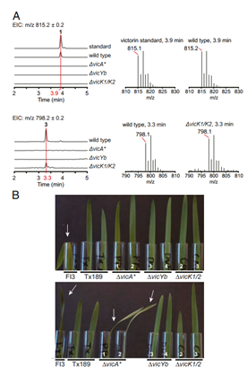 20世纪40年代,燕麦叶枯病在燕麦种植区域大面积发生,随后人们发现这种病害的流行与发生与一种病原真菌分泌的寄主选择性毒素息息相关。引起燕麦叶枯病的是一种死体营养型病原真菌Cochliobolus victoriae,它能分泌一种寄主选择性毒素victorin。C. victoriae对感病品种的致病力完全取决于毒素victorin,后来人们发现感病品种中毒素victorin的靶标是Vb基因,而恰恰Vb基因和燕麦抗冠锈病(Puccinia coronata)的Pc-2基因是同一个基因。由于C. victoriae包含多个非蛋白氨基酸,并且C. victoriae和玉米圆斑病菌Cochliobolus carbonum亲缘关系很近,而且C. carbonum产生的环四肽HC-toxin是通过NRPS合成的,所以victorin一直被假定也是由NRPS途径合成的。