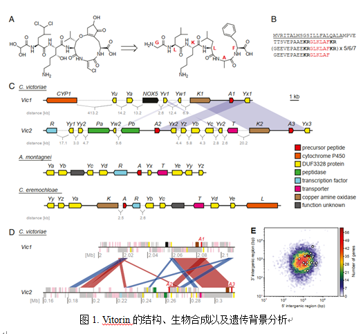 在文中,作者阐述了victorin是核糖体合成和翻译后修饰多肽(Ribosomally synthesized and posttranslationally modified peptide, RiPP)家族的产物。通过长片段测序组装后的新基因组序列分析,发现在C. victoriae整个基因组序列中包含3个前体肽合成基因(vicA1-3)拷贝,每个拷贝所包含的组成victorin肽骨架的核心肽(GLKLAF)重复数不同。vicA1-3位于基因组高度重复而基因稀少的区域,与几个可能与victorin形成相关的基因组成基因簇。敲除vicA一个基因拷贝就导致了victorin产量的大大降低。敲除基因簇中编码DUF3328蛋白的基因(VicYb),victorin就完全不能产生,这也证明了DUF3328蛋白负责victorin的氧化环化作用。另外,作者揭示了由vicK编码的铜胺氧化酶(Copper amine oxidase)的敲除导致了victorin前体(HV-toxin)的大量积累,这说明vicK的作用时将HV-toxin转化成victorin.