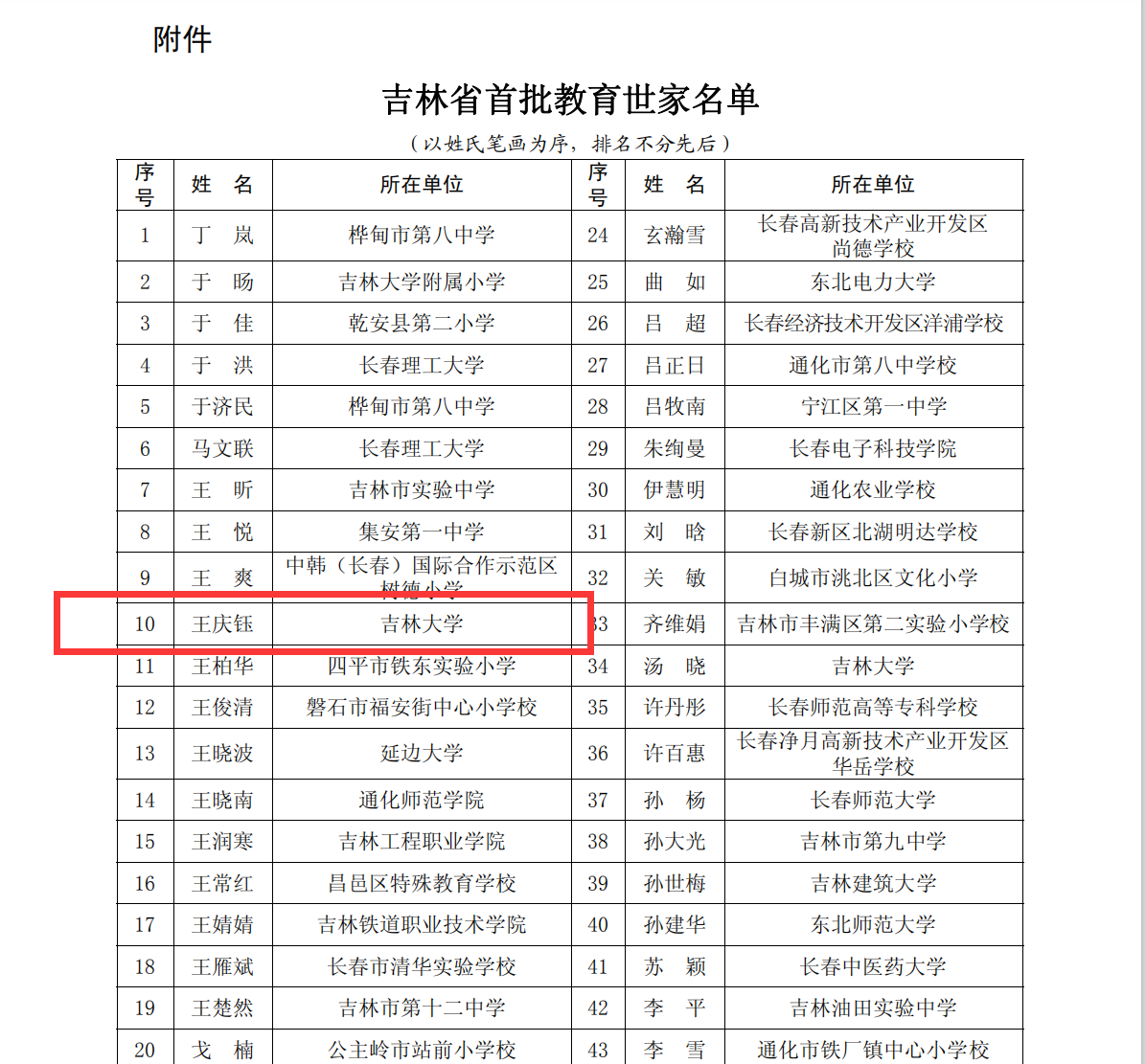 吉林省教育厅、吉林省总工会在全省范围内,认定了100个世家,太阳集团tyc33455王庆钰教授家庭喜获教育世家荣誉称号。