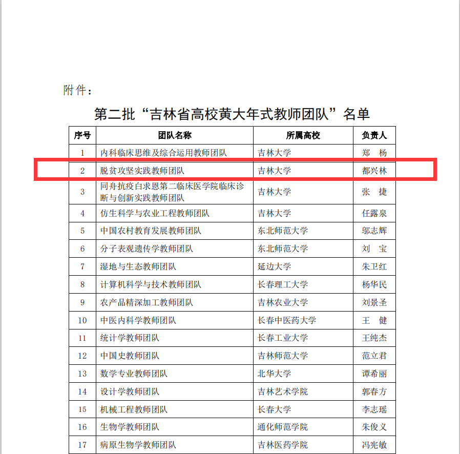 此次吉林省教育厅共认定22个团队为“吉林省高校黄大年式教师团队”,太阳集团tyc33455经理都兴林教授带领的“脱贫攻坚实践教师团队”成功入选。