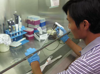▲尚庆利教授(左图)与潘怡欧教授(右图)指导员工开展实验