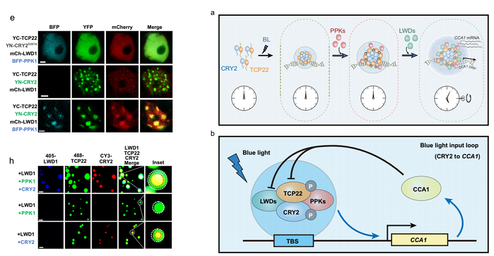 蓝光如何通过光受体调控植物生物钟的具体分子机制一直未被解析。该研究首先利用高分辨率质谱技术,IP鉴定得到一个转录因子TCP22(TCP22之前被证明能够调控生物钟核心振荡器CCA1的表达)。然而和本课题组之前发表的CRY2的互作蛋白不同3, 4,TCP22并没有和CRY2有蓝光依赖的互作。进一步实验发现CRY2/TCP22可以形成蓝光依赖的“光小体”,据此推测,CRY2是以此方式介导了蓝光调控生物钟的;为了进一步解析其机制,作者通过Co-IP筛选发现PPKs是TCP22的蛋白激酶,不仅可以调控TCP22的磷酸化,还能调控CRY2/TCP22的“光小体”。最终作者证明CRY2/TCP22形成蓝光依赖的“光小体”,招募蛋白激酶PPK和共激活因子LWD入“光小体”,最终激活了CCA1表达,从而介导蓝光调控了植物生物钟的分子机制。