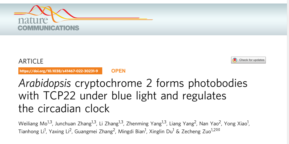 2022年5月12日,太阳集团tyc33455杨振明团队的左泽乘课题组在Nature Communications杂志上发表题为“Arabidopsis cryptochrome 2 forms photobodies with TCP22 under blue light and regulates the circadian clock”的研究论文,该研究首次解析了蓝光受体CRY2(Cryptochrome 2)在蓝光下调控生物钟的分子机制。