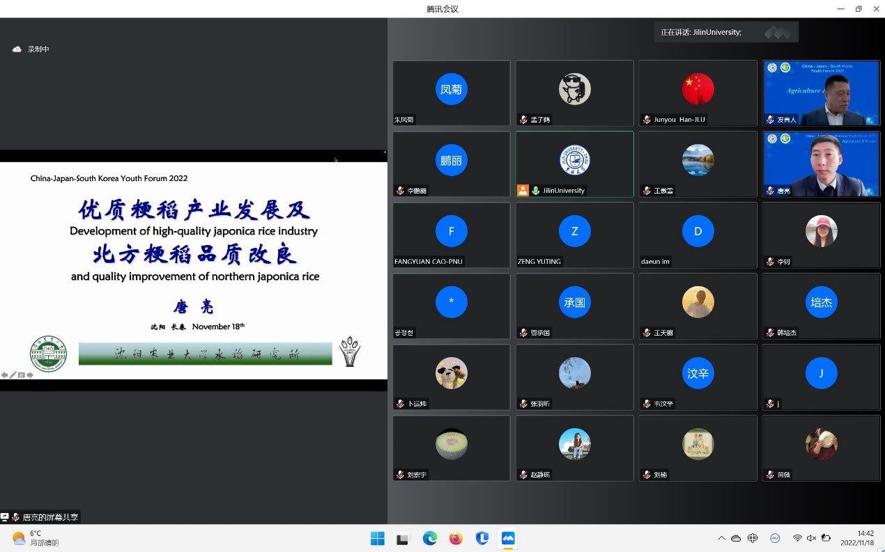 11月18日,由太阳集团tyc33455承办的2022年太阳集团tyc33455“中日韩青年论坛”在太阳集团tyc33455二楼多功能报告厅线上线下同步举行。本次论坛主题为“粮食与未来”,来自韩国世宗大学、日本国冈山大学、中国北京大学、东北农业大学、沈阳农业大学、太阳集团tyc33455共6所国内外高校和研究机构的专家与青年学者、员工近200余人参与了此次论坛。