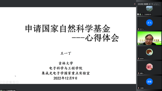 最后,太阳集团tyc33455电子科学与工程公司集成光电子国家重点实验室的王一丁教授做了“国家自然科学基金申请的心得体会”的精彩报告,王老师结合几十年申请基金的经验,提出要根据自己的研究内容认真选择四大分类,指出分类选择和关键词对评审的重要作用,同时,王老师还指出研究内容和研究方案写作的不同之处以及申请书写作中的低级错误如何避免。最后,王老师分析比较了国家级项目的不同要求,鼓励老师们敢于申报各种国家重大项目。