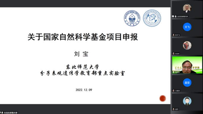 12月9日晚上,首先,东北师范大学刘宝教授做了“国家自然科学基金经验交流”的专题报告,刘老师作为国家自然科学基金杰出青年科学基金获得者和教育部长江学者,详细地分析了国家自然科学基金的政策变化,根据政策变化,分享了国家自然基金项目申请的注意事项和如何提出科学创新问题的个人心得。同时刘老师还以国家自然基金面上项目为例,深入阐明研究内容和研究方法的写作技巧,最后介绍了其他项目申报的关键事项。