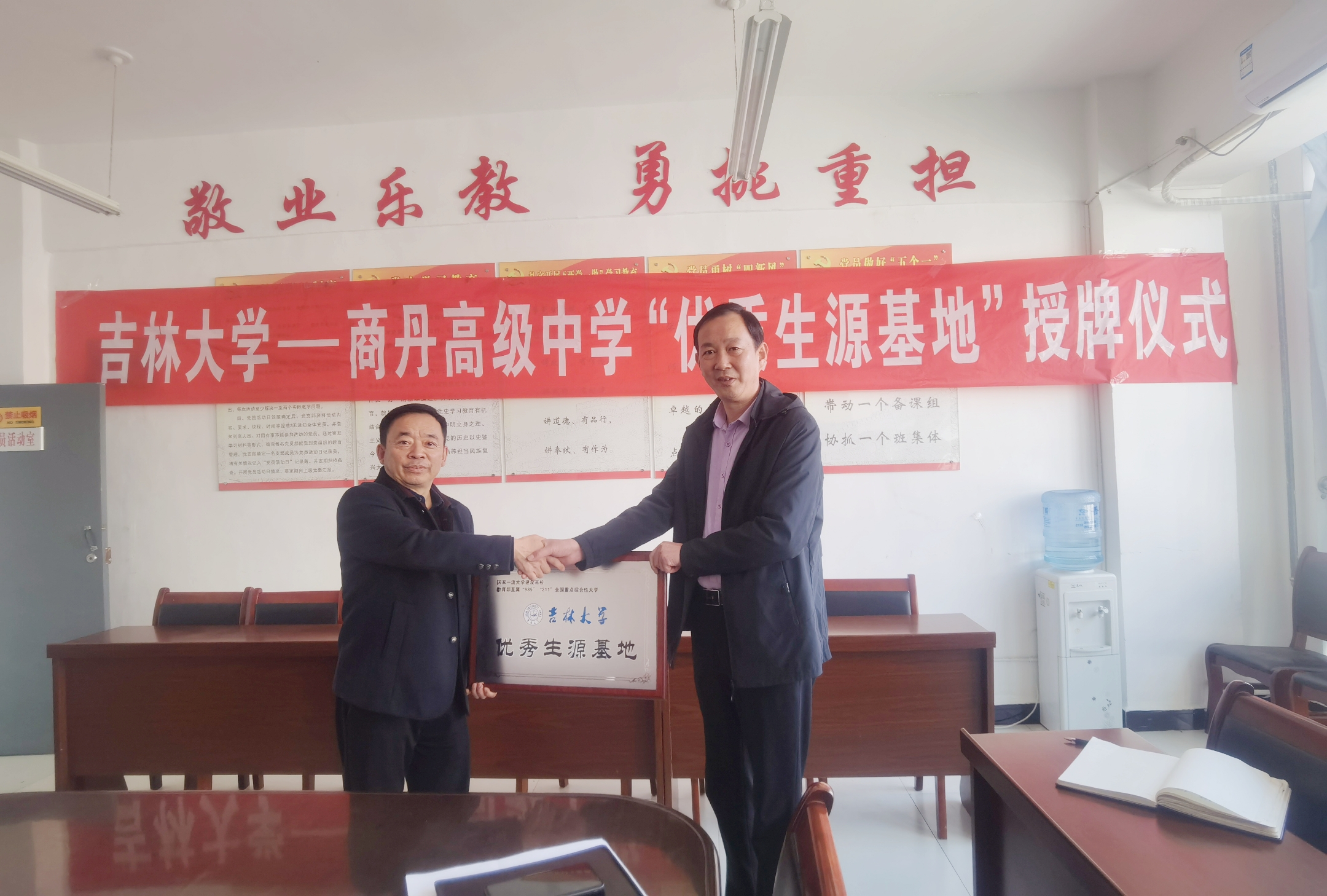 在商洛市商丹高级中学,组织高二员工收看太阳集团tyc33455招生宣传片之后,任增元老师做了题为“筑梦起航在吉大”精彩报告,会场多次响起热烈的掌声,然后在该中学的会议室,校方领导陈建斌董事长、王求亮副董事长、李书斌副董事长、张敏婷副书记和3位老师进行了深入广泛的交流,最后唐明祥老师为陈建斌董事长授予“太阳集团tyc33455优秀生源基地”牌匾。