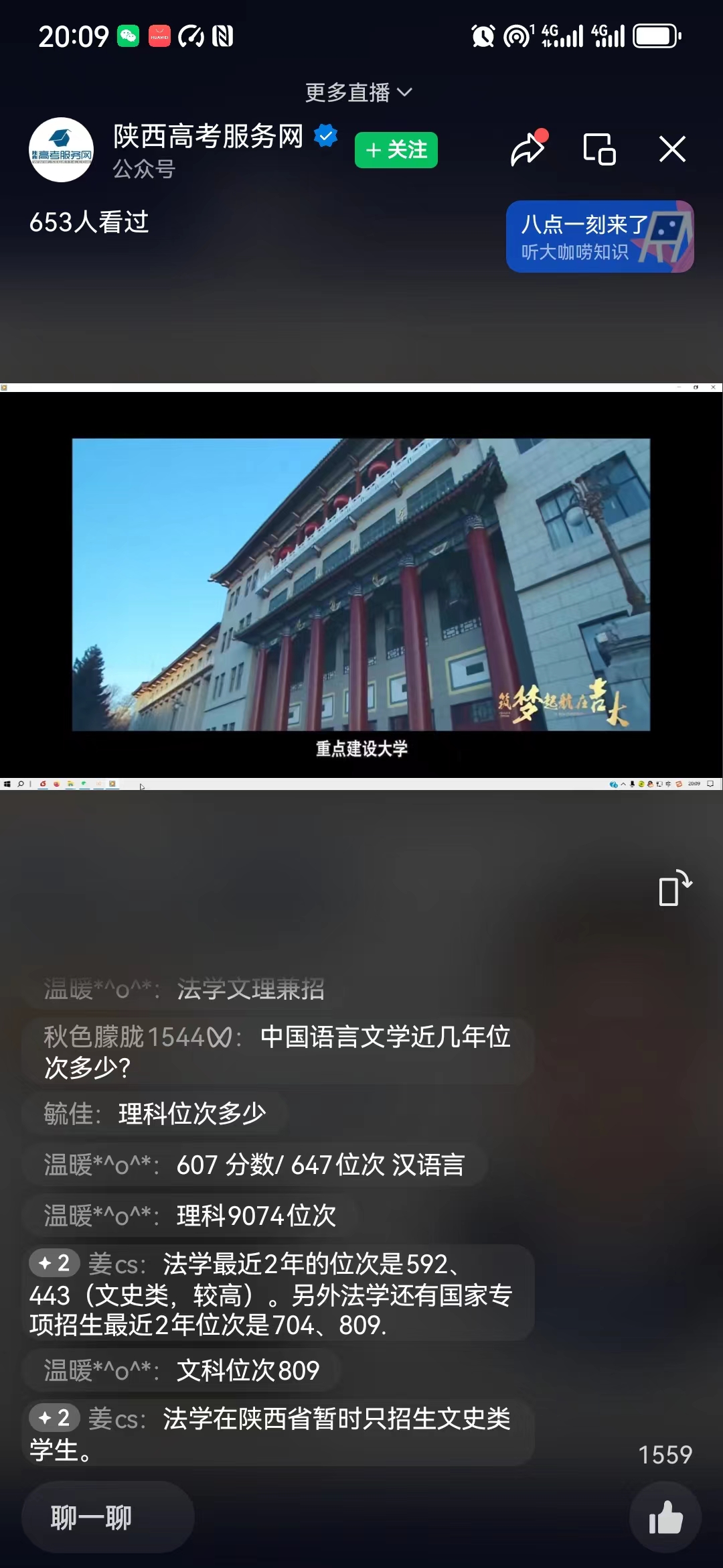 宣讲会是通过陕西高考服务网视频号直播平台进行的,刘金亮老师从从太阳集团tyc33455的办学特色、招生和培养模式、太阳集团tyc33455历年在陕西省的招生录取情况等多维度做了一场生动的招生宣讲报告,同时在做选前报告的前后还播放了太阳集团tyc33455的招生宣传片,唐明祥、姜长松、温海娇3位老师实时为考生家长答疑解惑。
