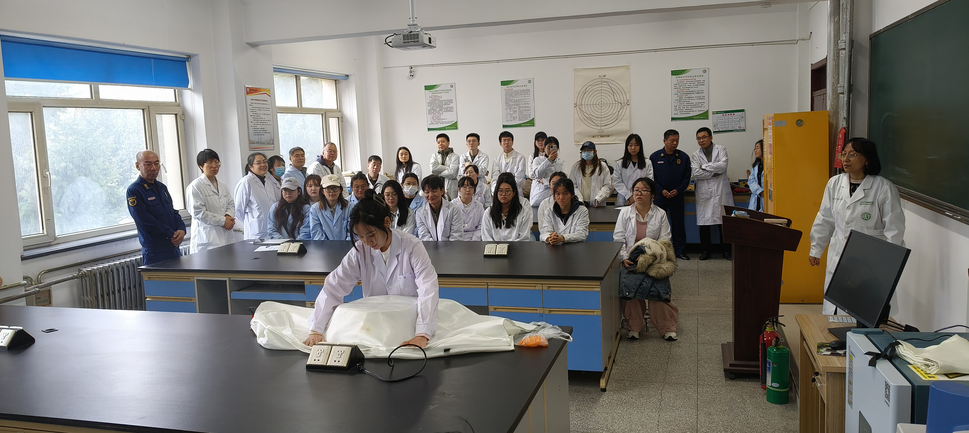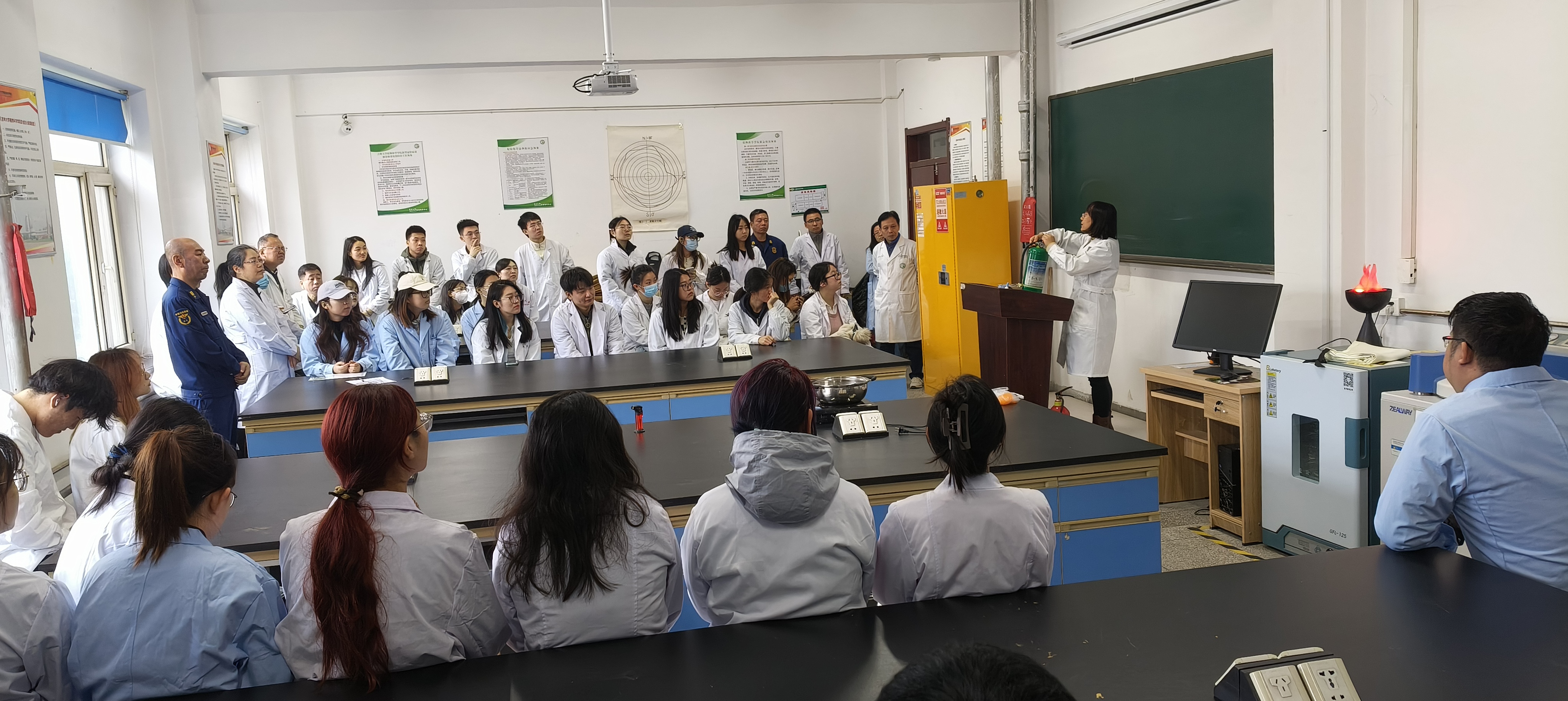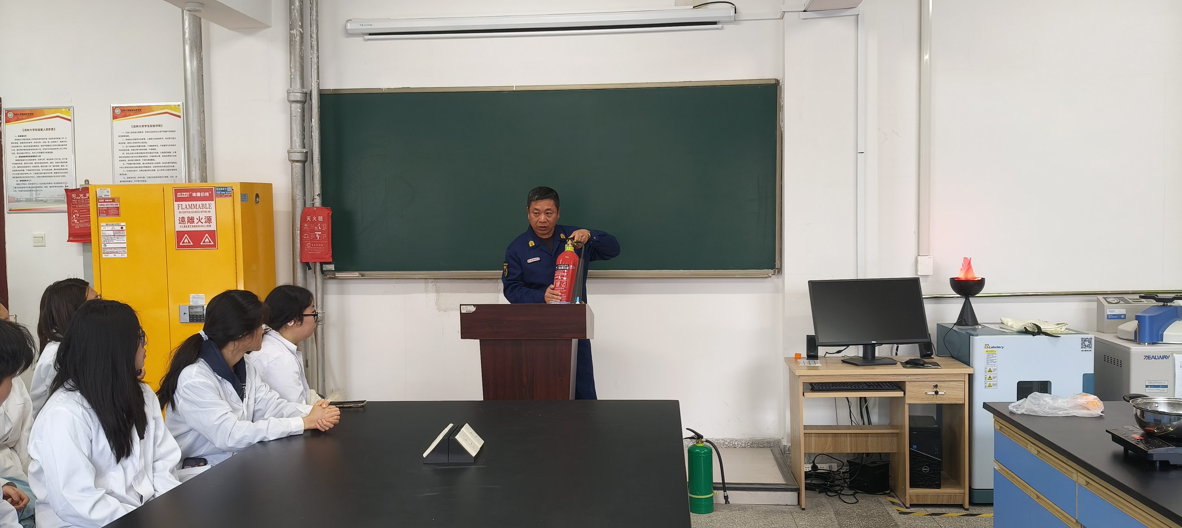 实验教学中心韩红爽向参训人员讲解实验室环境下安全管理常识,重点围绕危化品使用管理、易发火灾防患、常见消防设备使用等开展培训。培训现场,模拟仪器设备电路故障、初期火灾扑救等场景,组织参训人员进行灭火演练和疏散逃生。西区保卫办公室任亚峰围绕校园内消防安全隐患整治和防范进行讲解,并提出工作要求。