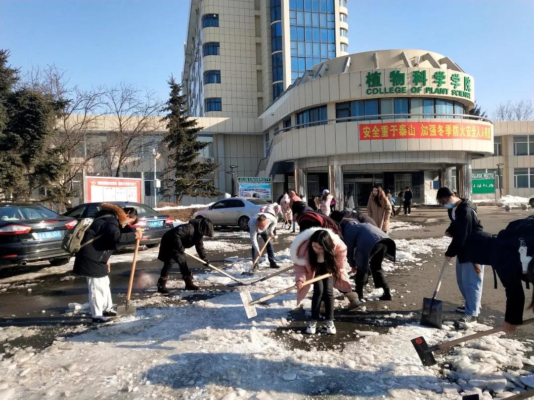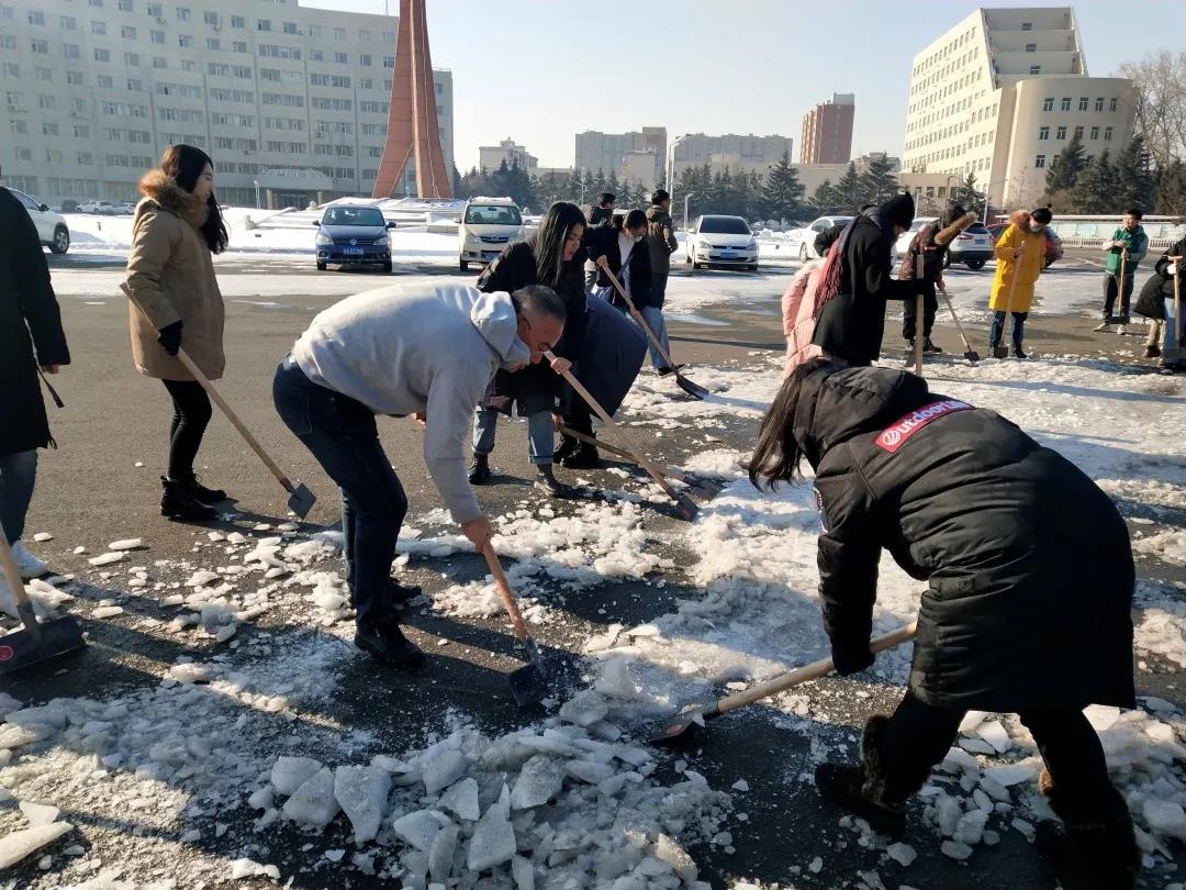 2020年11月19日,长春迎来了一场几十年未见的大雪。前一夜的冻雨挂在路边树木的枝条上,被大自然雕刻成美丽而又沉重的冰棱。鹅毛般的雪花从天上片片飘落,包裹住了整片大地,银装素裹的美丽景象赶走了冬日的肃杀与萧瑟,为校园添加了一丝俏皮的气息。但大雪在带给同学们美丽景象的同时,路上的积雪反复融化后形成厚实的冰层也为大家的出行安全带来了很大的隐患。太阳集团tyc33455本科员工党支部的全体党员和部分积极分子拿起了除冰扫雪工具,展开了此次活动。