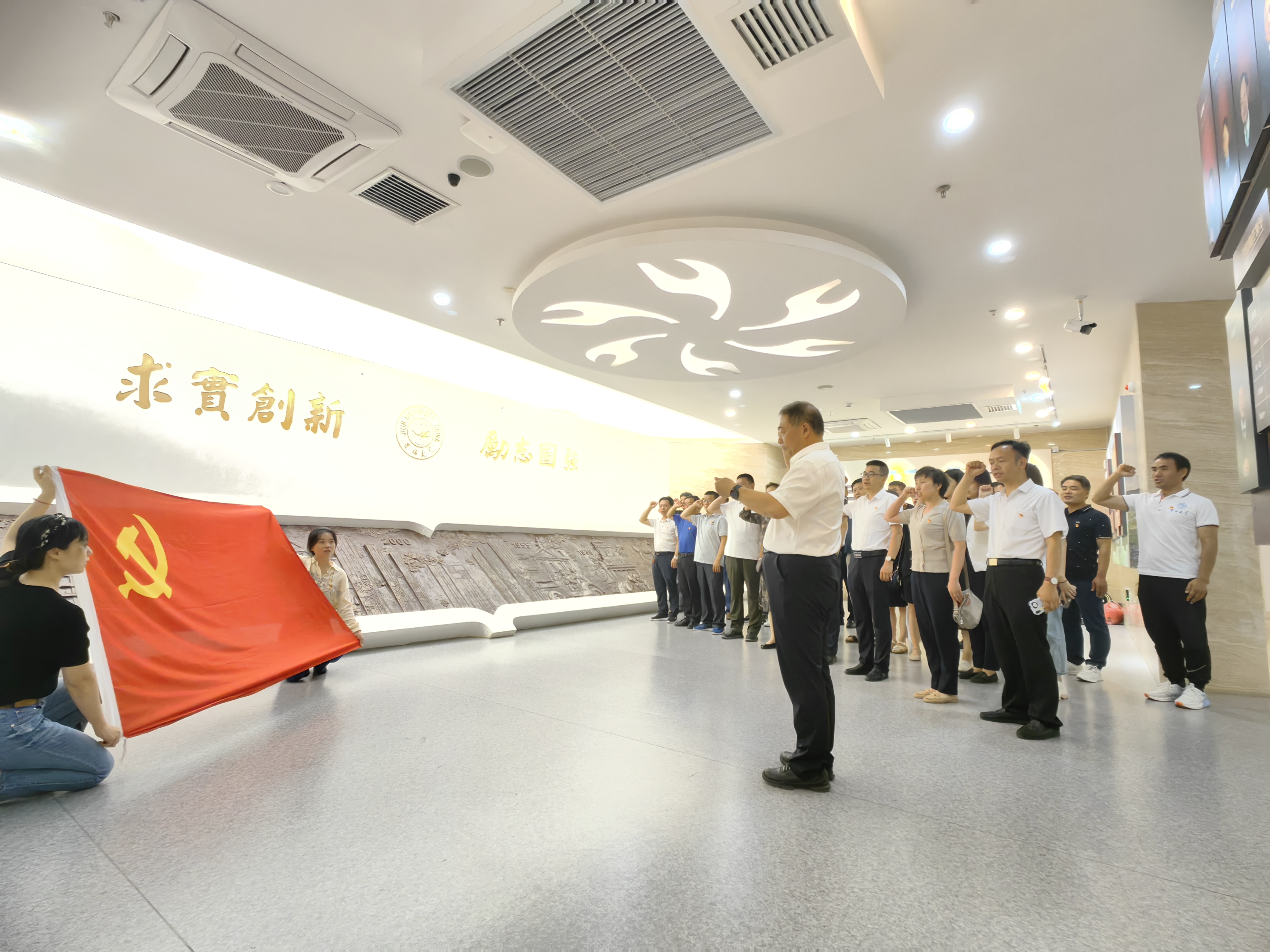 参观开始前,在党委书记于生宗同志的带领下,全体党员面向党旗重温入党誓词。紧握右拳高高举起,面向党旗庄严宣誓,一句句铿锵有力的誓词,一声声坚定的话语在耳边回响,这是全体党员对党的承诺。
