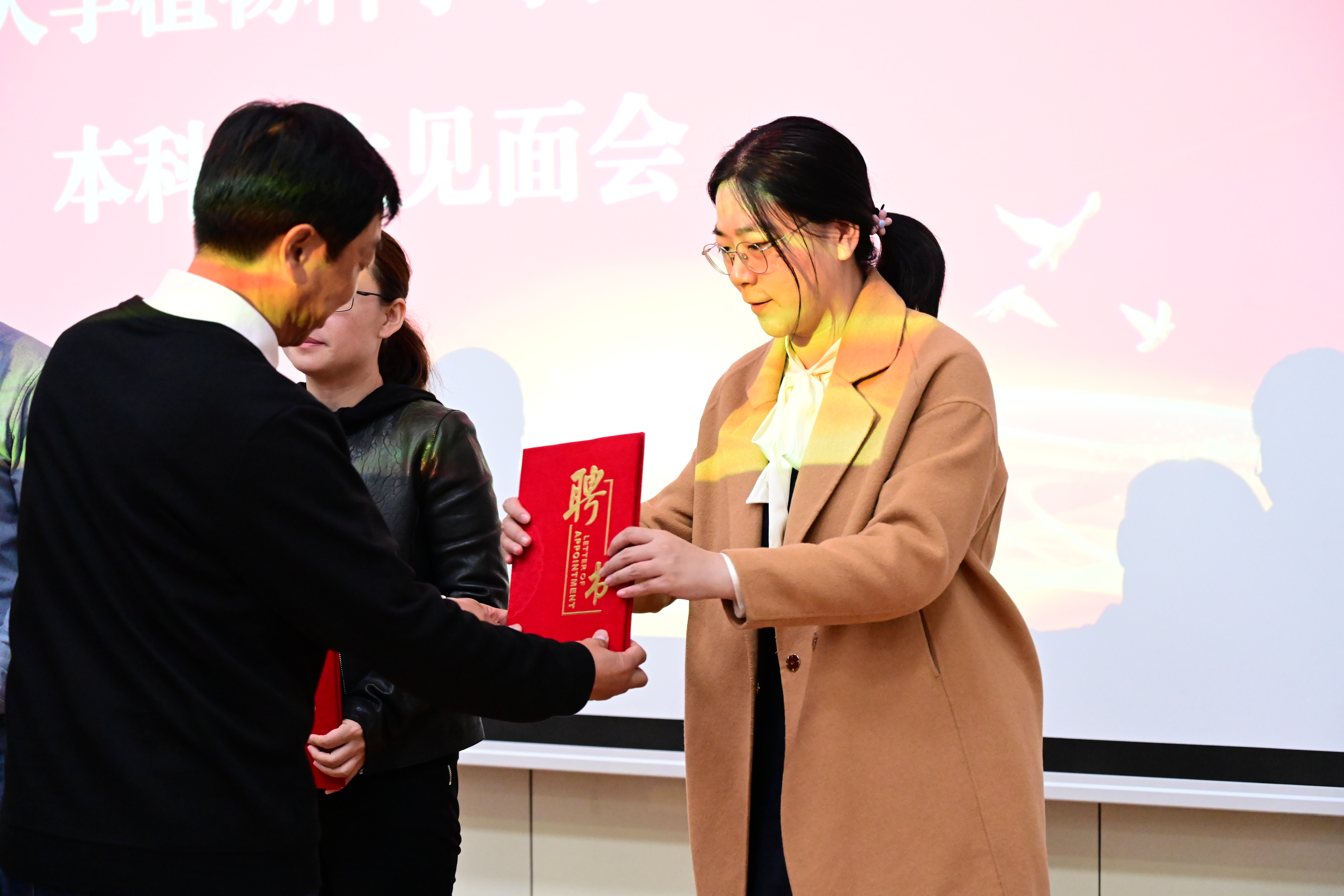 随后,开展了新生班主任聘任仪式,经理都兴林为2021级新生班主任颁发聘书并合影留念。李钊老师代表新生班主任发言。她对同学们的到来表达了热烈的欢迎,同时表示全体班主任愿与同学们携手,在未来的前进道路上赓续太阳集团tyc33455的奋斗精神,绘就辉煌新篇章。相信新生们一定能够锐意进取,在老师们的引导下日臻优秀,树立家国情怀,严于律己,持之以恒,成为国家的栋梁。