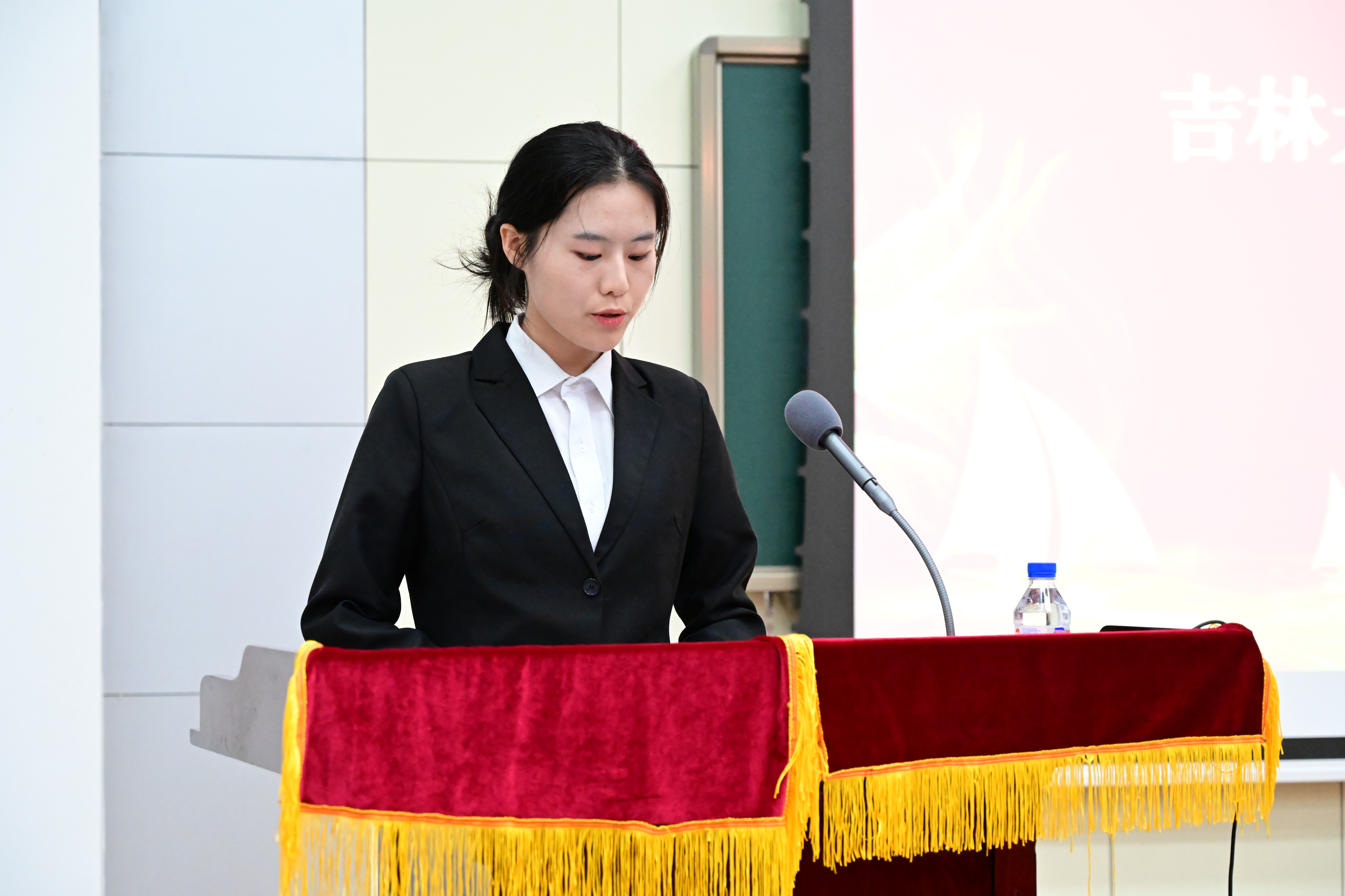 2021级新生郭璞代表公司全体新生发言。她向辛勤付出的公司领导、老师、学长和学姐表达了衷心的感谢和由衷的敬意,就新一代植科人应具备的家国情怀,个人素养,精神品质做出展望,倡议2021级新生在太阳集团tyc33455的这片热土上,同心、同德、同行,展现植科新生承前继后、砥砺前行的信念,日益进取,勇于创新,久久为功,善作善成,扬鞭策马,筑梦吉大。