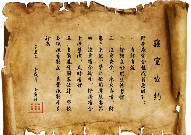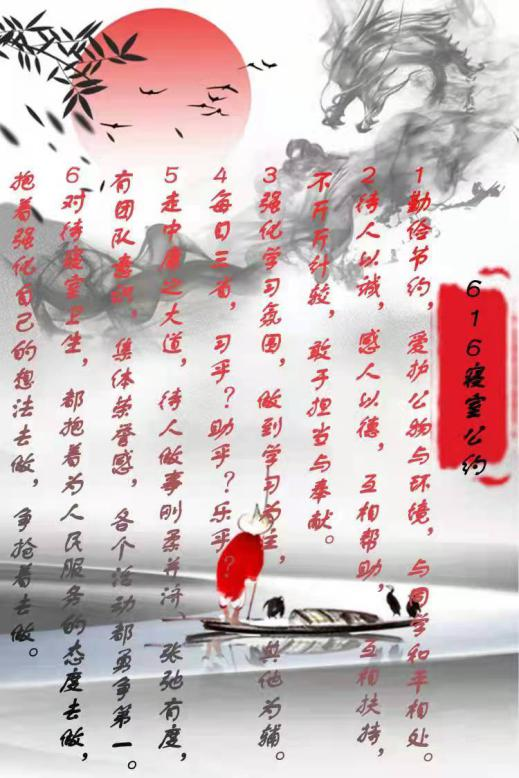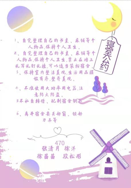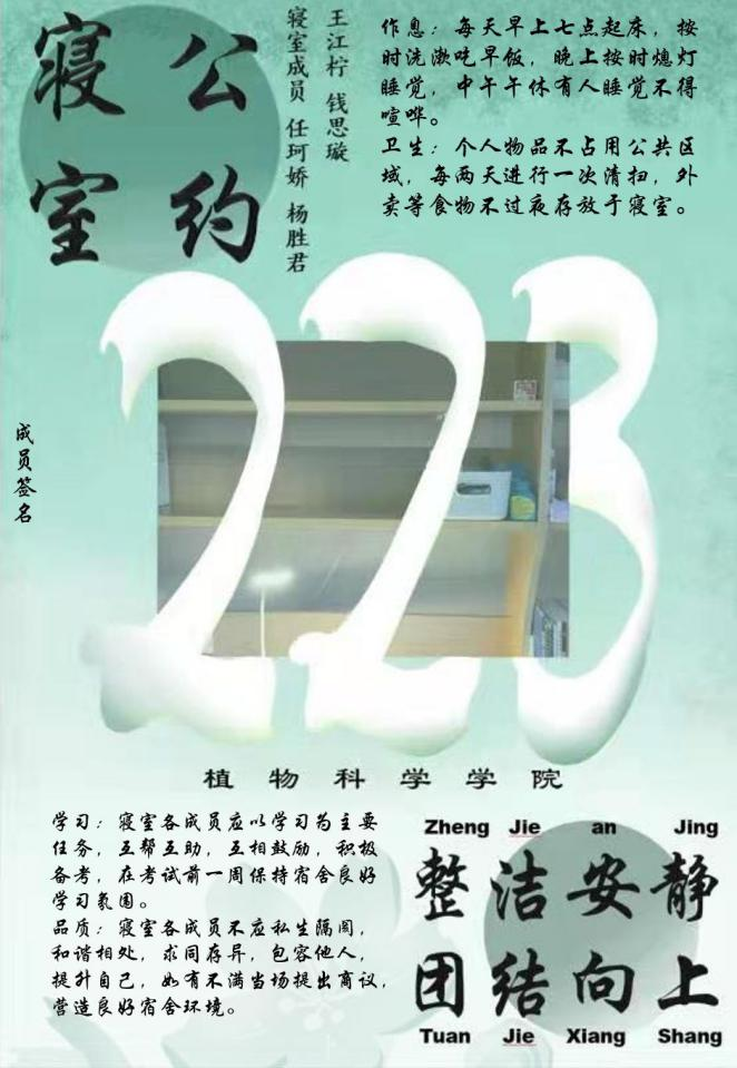 寝室文明不仅体现在物质装饰上,更体现于团结一致的寝室精神,寝室公约作为一个寝室共同遵守的准则,是寝室文化精神的最好诠释。希望各位同学能够以优秀寝室为榜样,积极发展寝室建设,营造寝室良好氛围,让寝室成为我们共同的家!