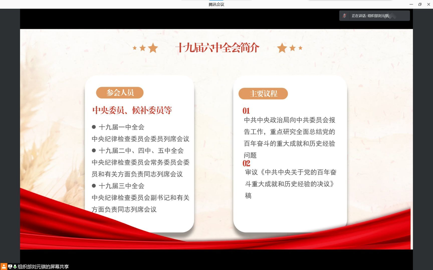 会议主要围绕“十九届六中全会会议介绍”、“党的百年奋斗重大成就和历史经验”、“改革开放以来历届六中全会”、“不忘初心实现第二个百年奋斗目标的新的赶考之路”四个方面的内容进行学习。