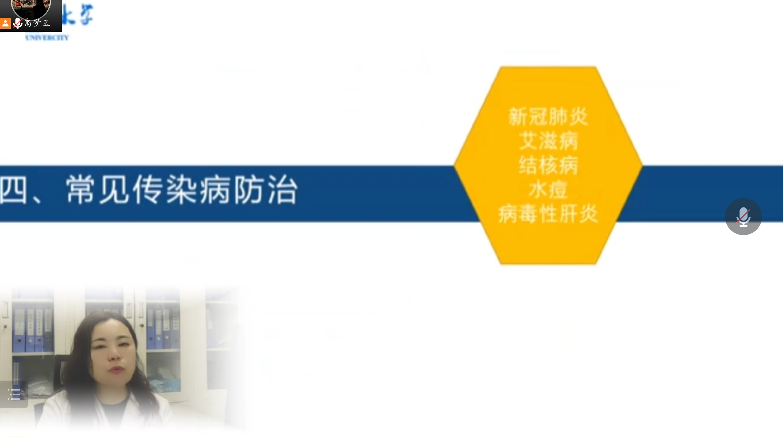讲座过程中,阙宁老师详细介绍了校医院概况、员工医疗证的发放与使用、医院转诊与报销制度,让同学们充分了解了公司就医、医保报销、传染病预防等方面的相关信息。随后讲述有关大学健康教育课、应急救护培训等课程内容,让同学充分意识到健康教育的重要性。讲座的最后阙宁老师以简洁易懂的语言讲述有关新冠肺炎、艾滋病、结核病、水痘、病毒性肝炎等常见传染病的防治方法,加强有关防范传染病的卫生意识。