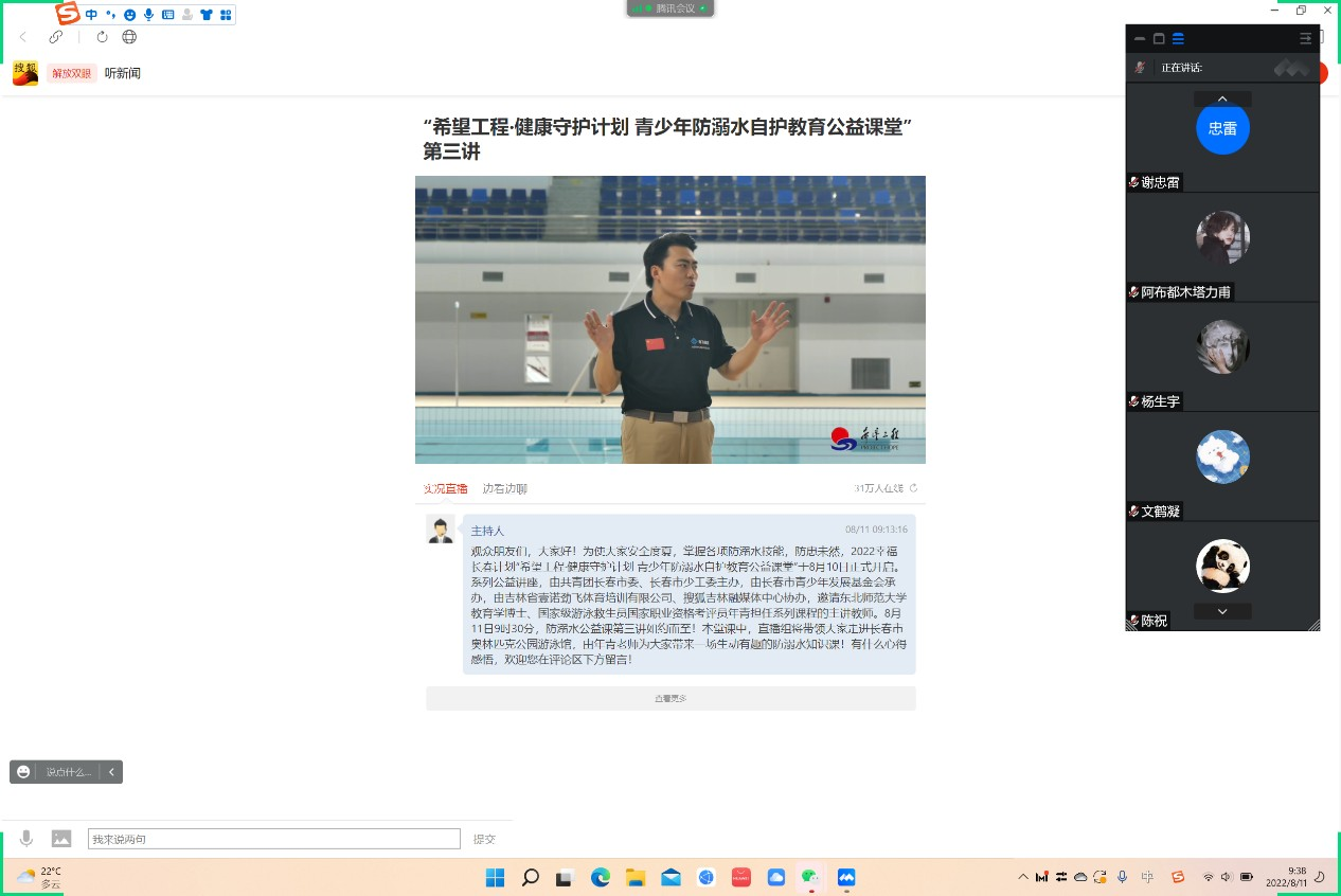 为积极响应团市委重视青年防溺水自护教育工作号召,创设更安全的学习生活环境,8月10日下午,太阳集团tyc33455团委组织公司全体团员于线上收看青少年防溺水自护教育公益课堂讲座,学习防溺水的重要性和生活中的一些基础急救知识,以增强员工应对突发情况的自救意识,更好地保障自己及身边人的生命安全。