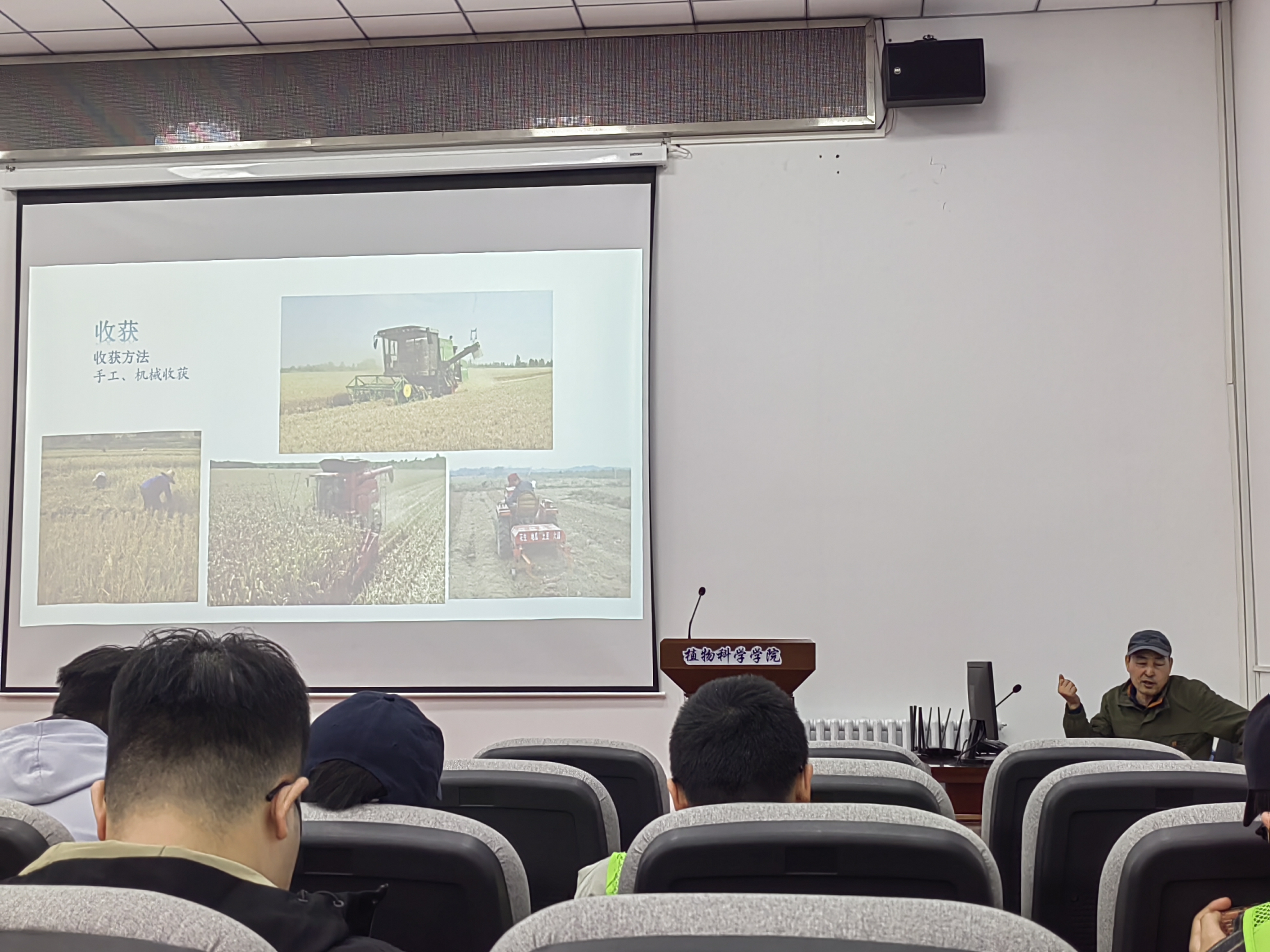 活动开始,作物学系教授李景文组织员工在智慧农业梦工场观看农作物播种、秋收等相关视频,为员工讲解农作物分类、农机具发展史、农机具在播种及秋收时的应用,并对员工提出的相关问题进行了细致解答。随后,实践基地工作人员为员工分发手套、播种器等一系列工具,带领员工前往实践教育基地。在基地内,李景文教授实地介绍了垄台、垄沟、土壤肥力梯度方向及试验田小区分区的方法,鼓励在场员工将所学知识与实践结合在一起,更好地理解书本中的内容,更深层次地体会劳动者的不易。介绍完毕,李景文教授亲自示范播种器的使用,并手把手教员工如何高效播种。师生一同体验播种的喜悦,将一粒粒希望的种子播撒在肥沃的土地上。整个过程氛围温暖,承载着梦想的种子在明媚春光的照耀下悄然生长。活动结束后,师生合影留念,师生沉浸在耕种收获的喜悦当中。